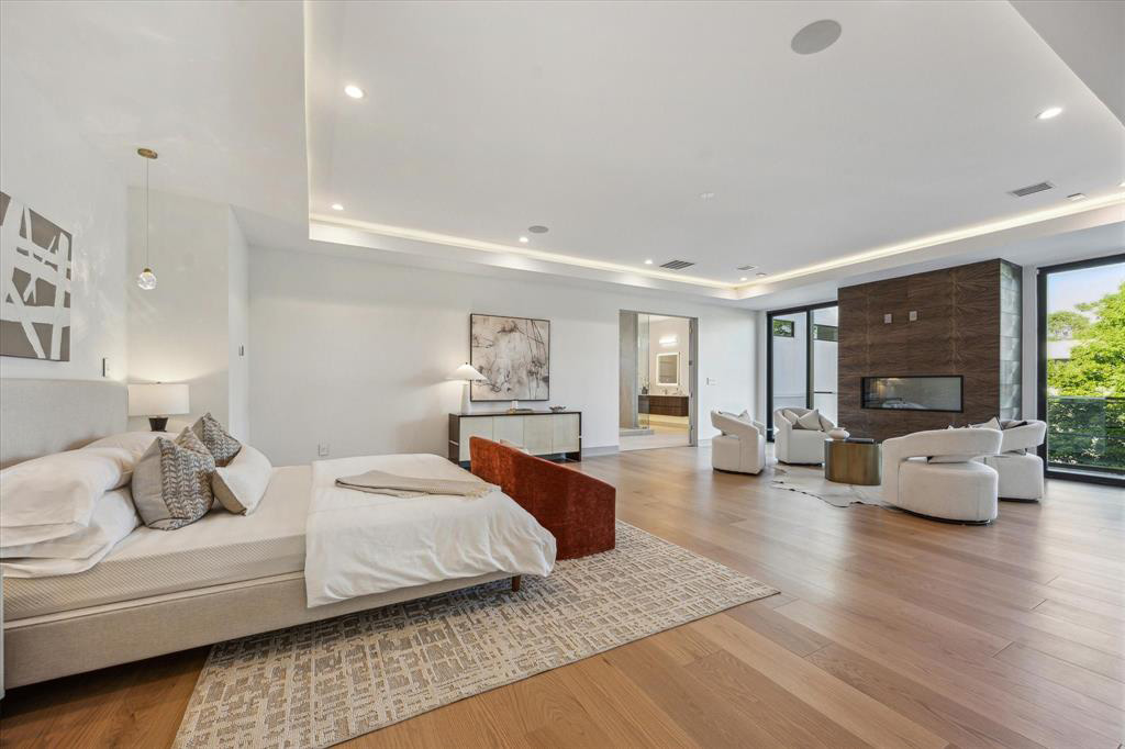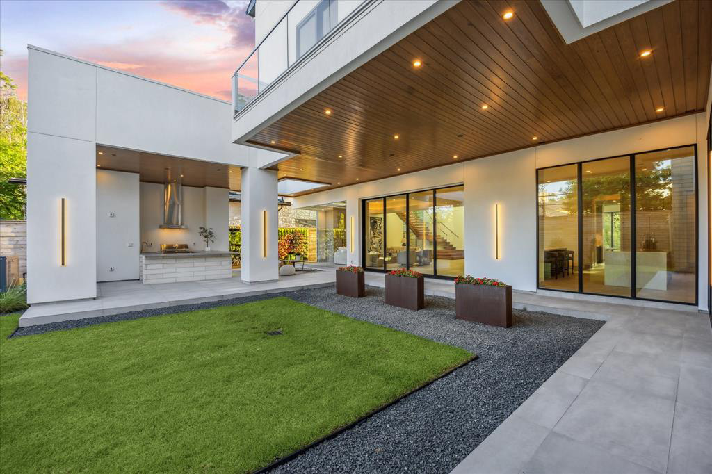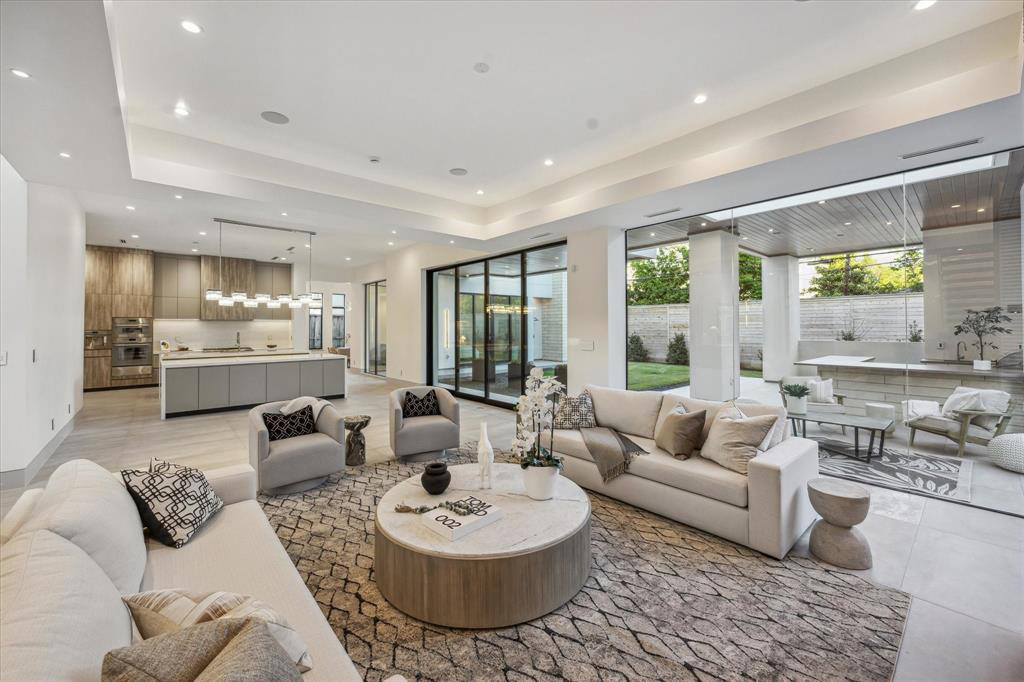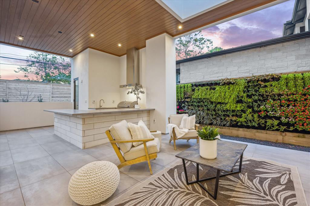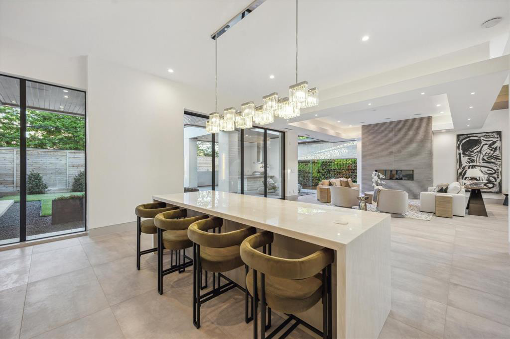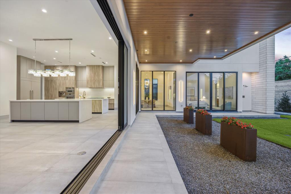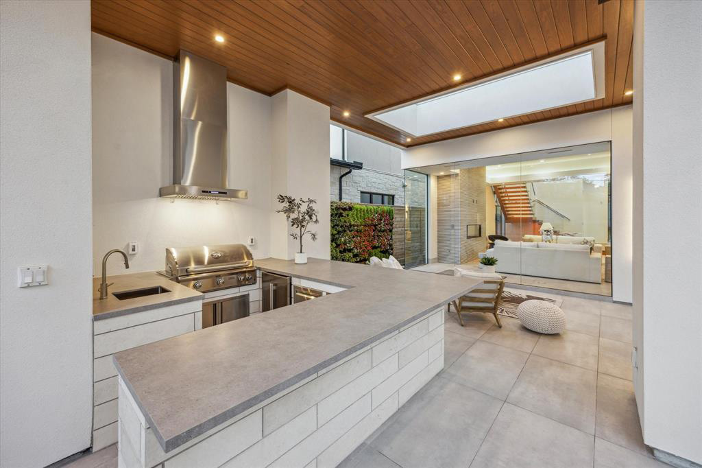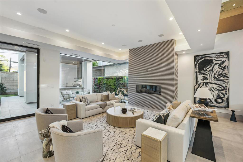 fireplace and moving glass wall views and access to landscaped back yard with a summer kitchen. Porcelain flooring from Spain.