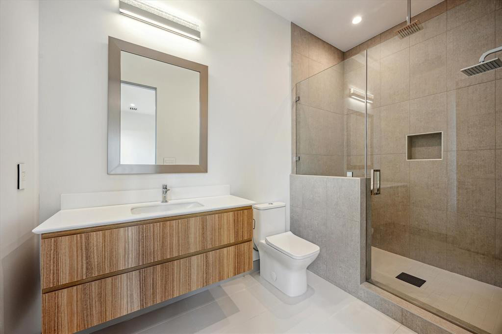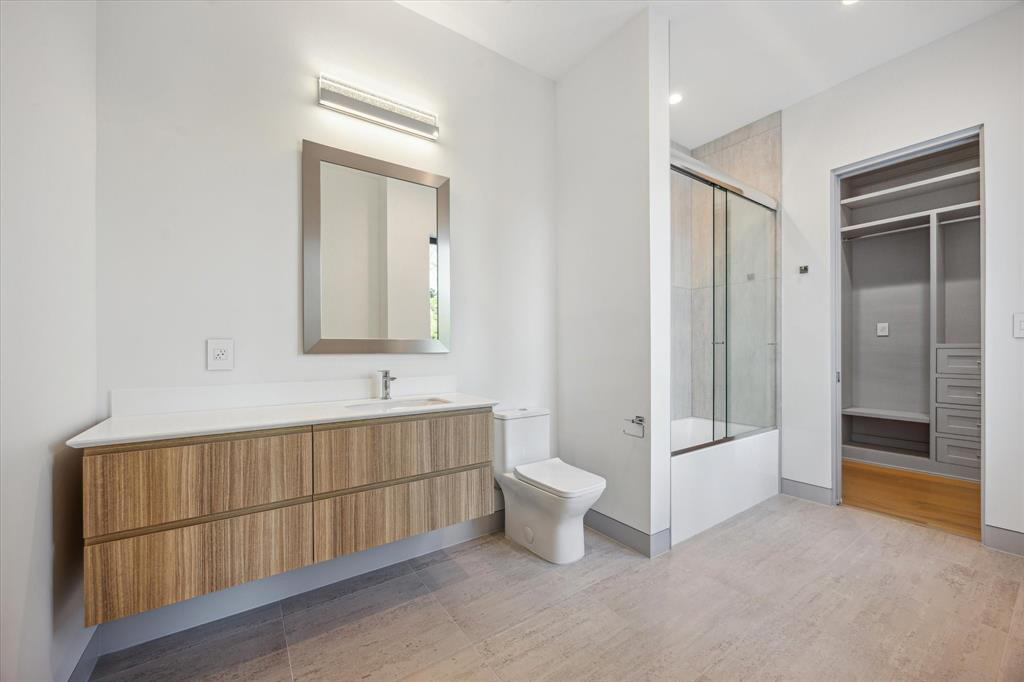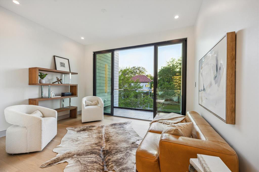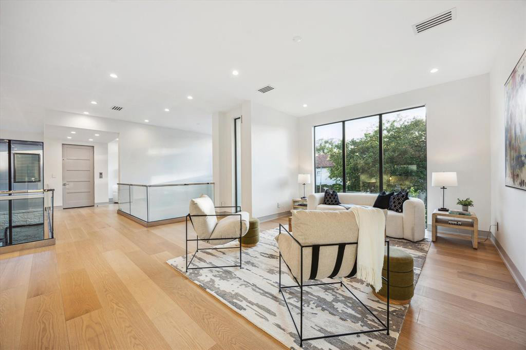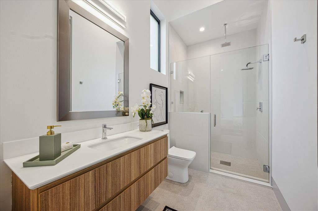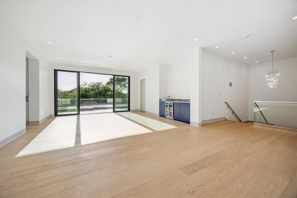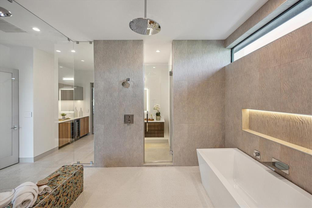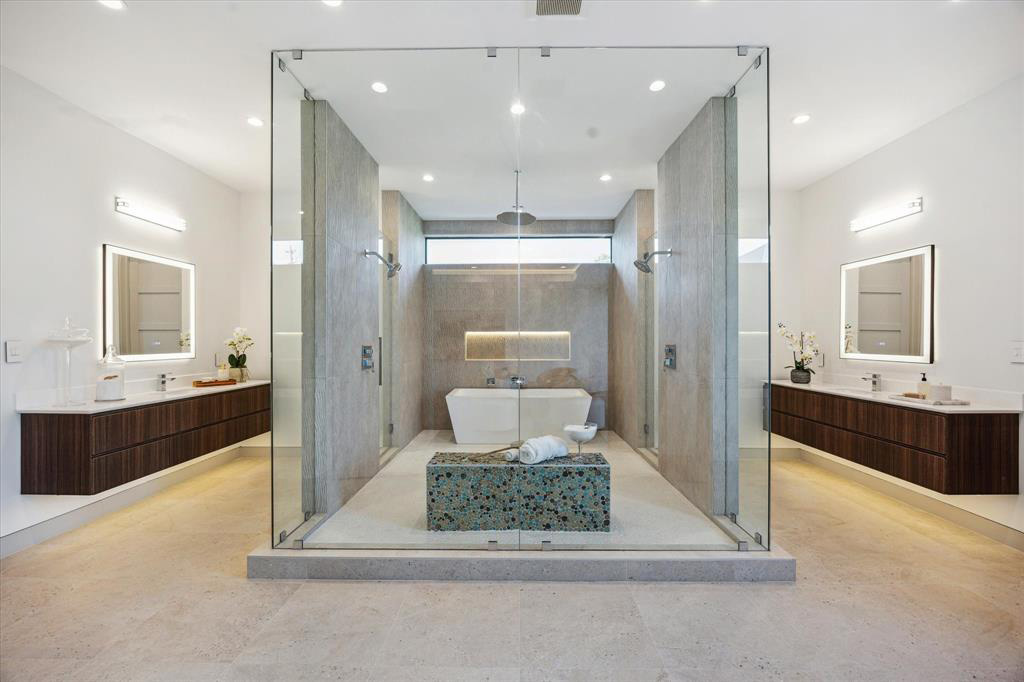 fireplace and moving glass wall views and access to landscaped back yard with a summer kitchen. Porcelain flooring from Spain.