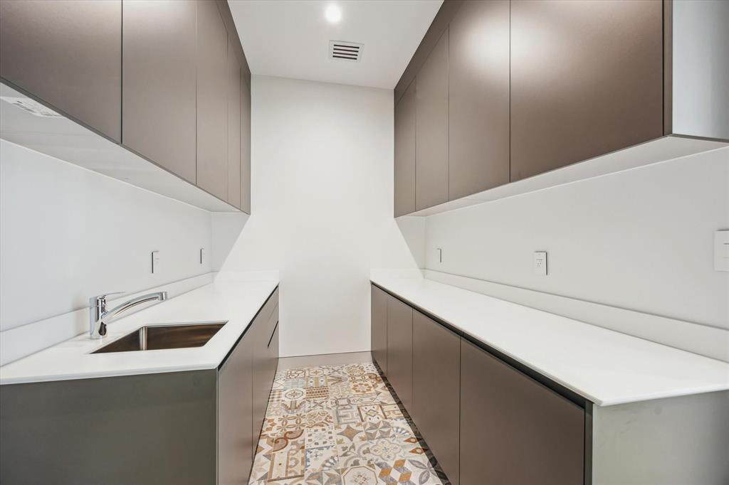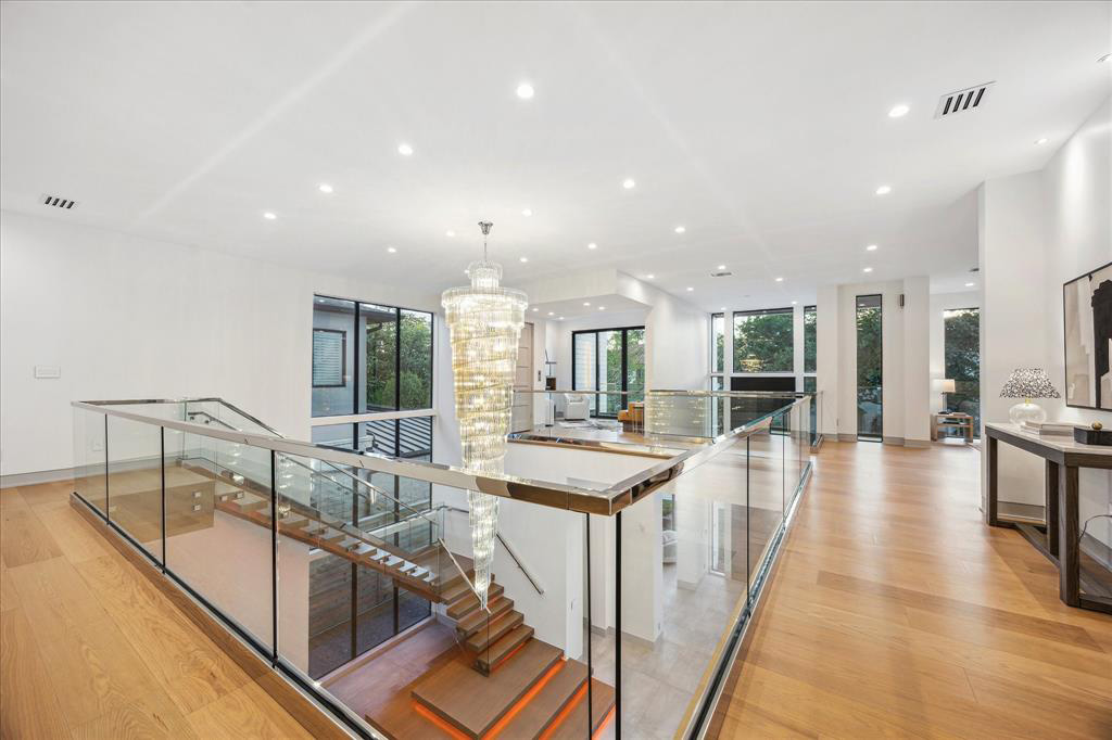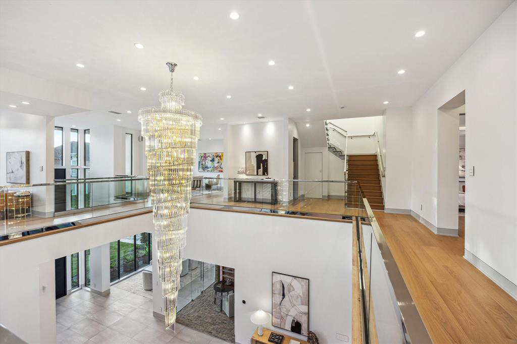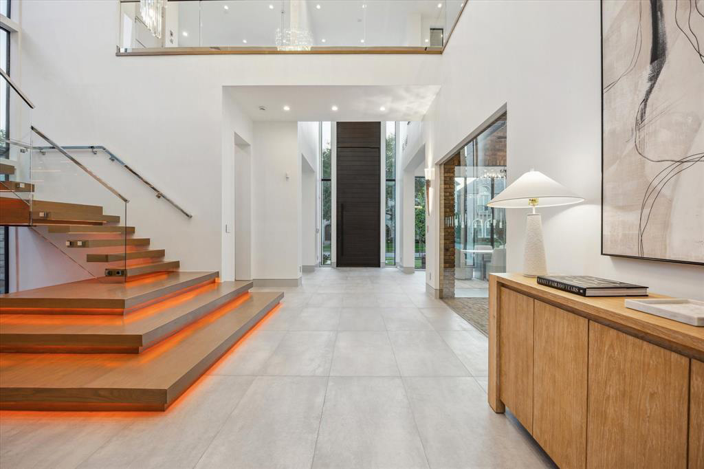 Central foyer with impressive stairway to second level with oak treads and frameless glass balustrade. Family room with