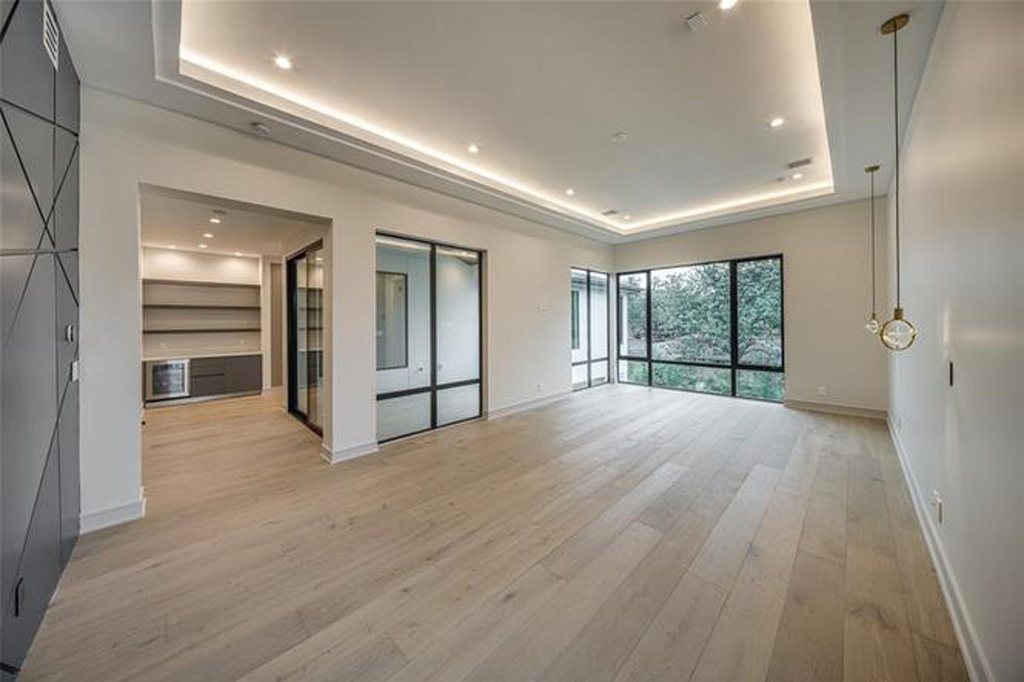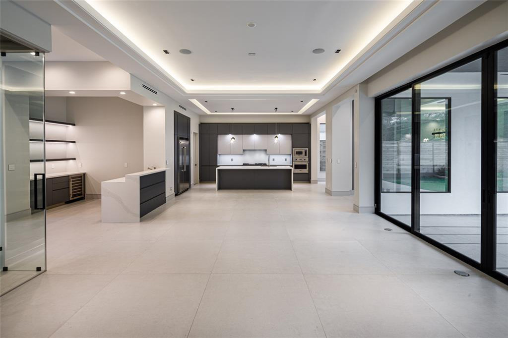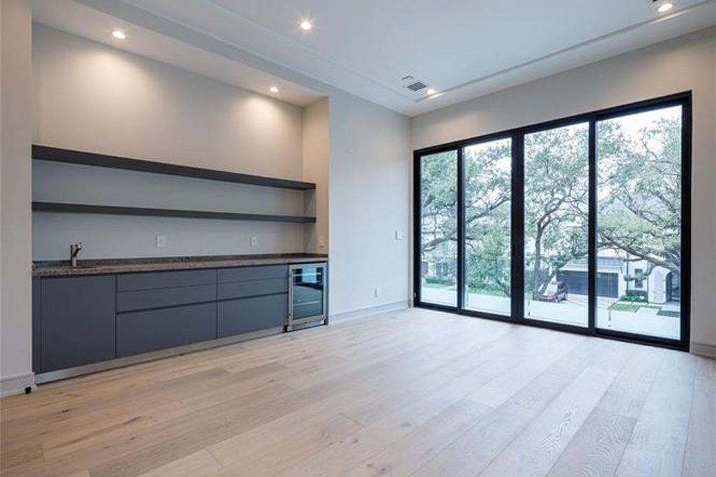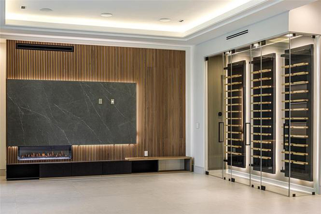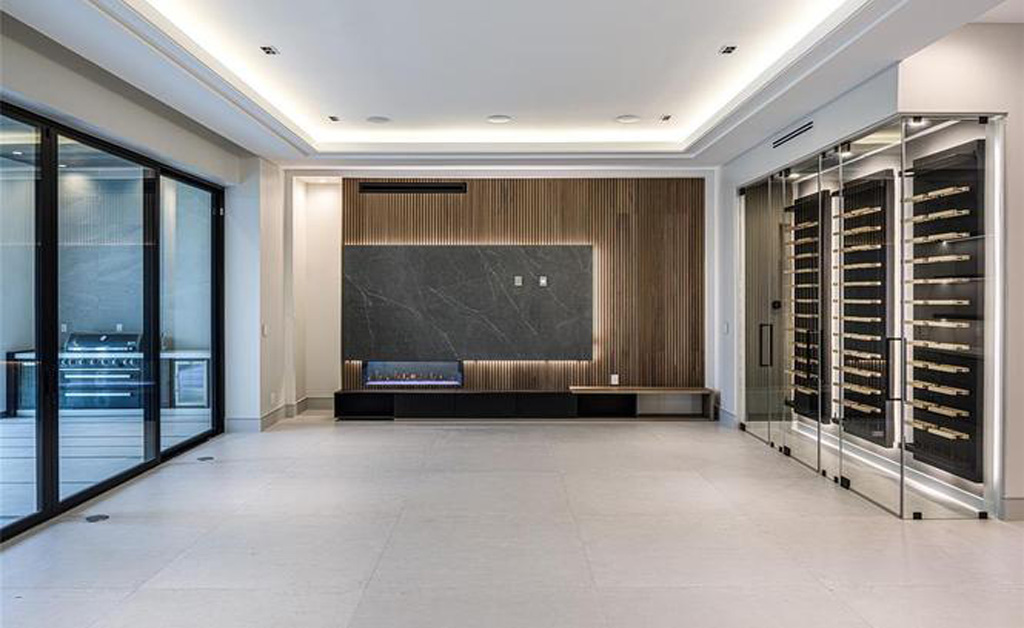 A family room with an amazing architectural design and details. Climate-controlled wine closet. Wet bar and sliding doors which