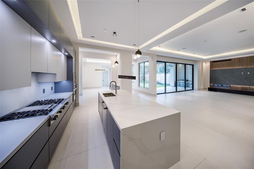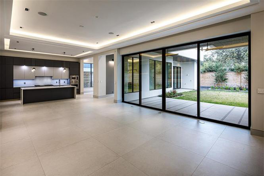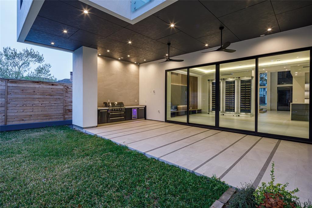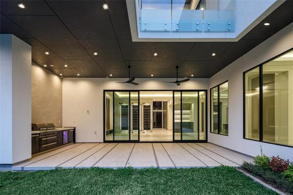 A family room with an amazing architectural design and details. Climate-controlled wine closet. Wet bar and sliding doors which