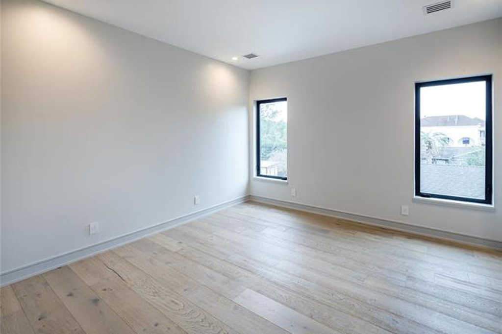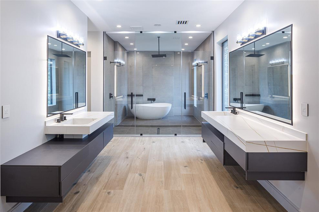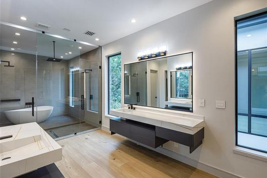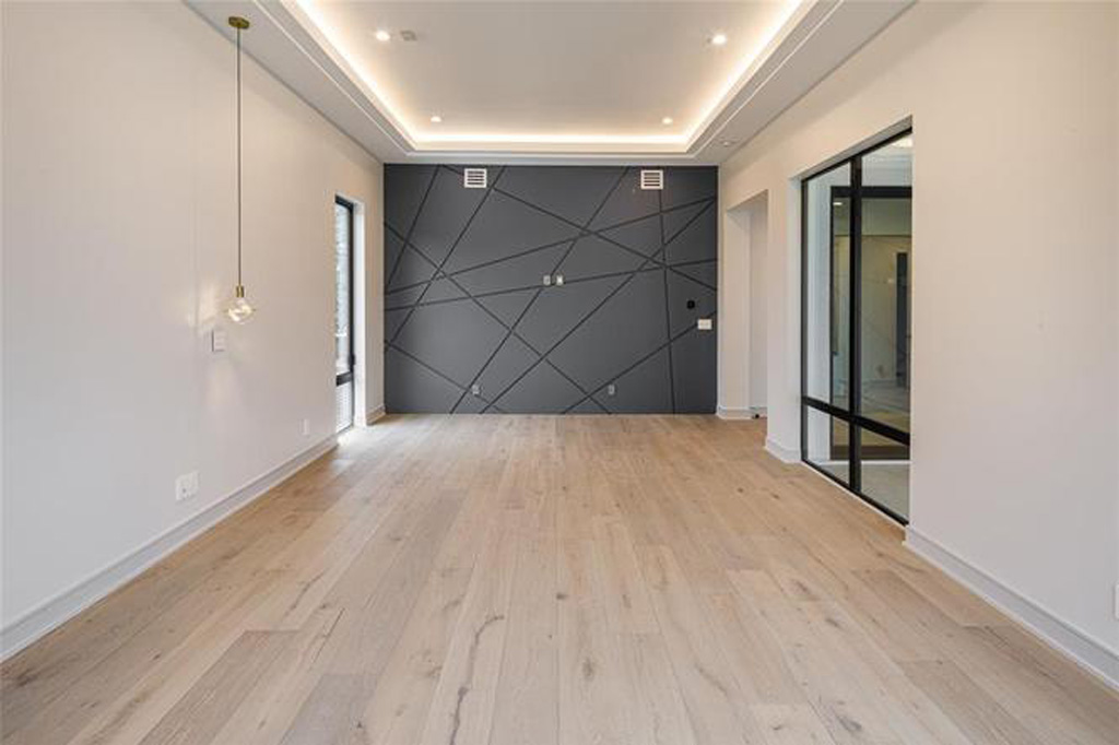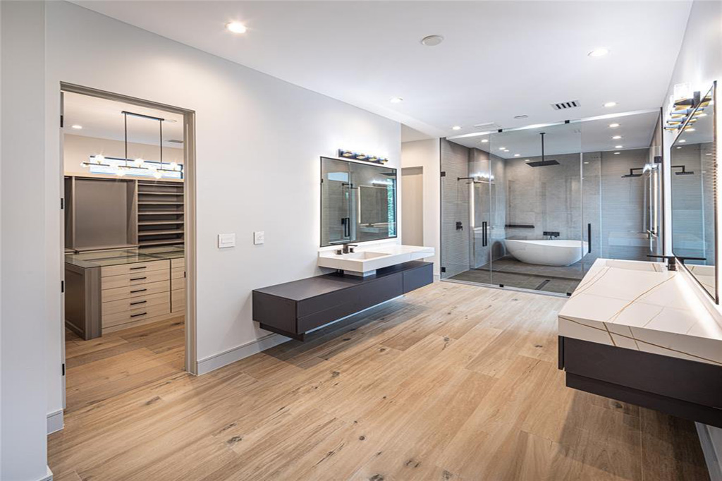Primary retreat with custom art wall, coffee bar, private terrace and french hardwood floors. Primary bathroom with double vanities,